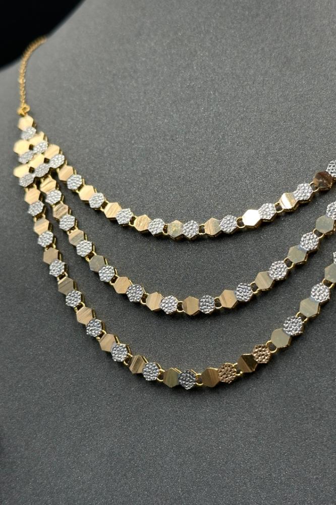 طقم عيار 21 فاخر بوزن 13.3 جرام، بتصميم ثلاث أدوار كلاسيكي يضفي لمسة أنوثة فخمة تناسب الاستخدام اليومي أو كهدية مميزة تبقى ذكرى خالدة.
