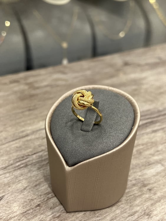 مرحبًا! خالد حلبي للذهب والمجوهرات يقدم لكِ خاتمًا ساحرًا من الذهب الصافي بتصميم مميز . هذا الخاتم هو التجسيد الحقيقي للإبداع والأناقة الغير تقليدية. دعيني أخبرك عن المواصفات الرائعة لهذا الخاتم: