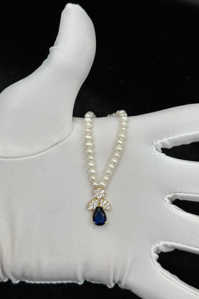 - عقد ذهب مع لؤلؤ مع فص ازرق