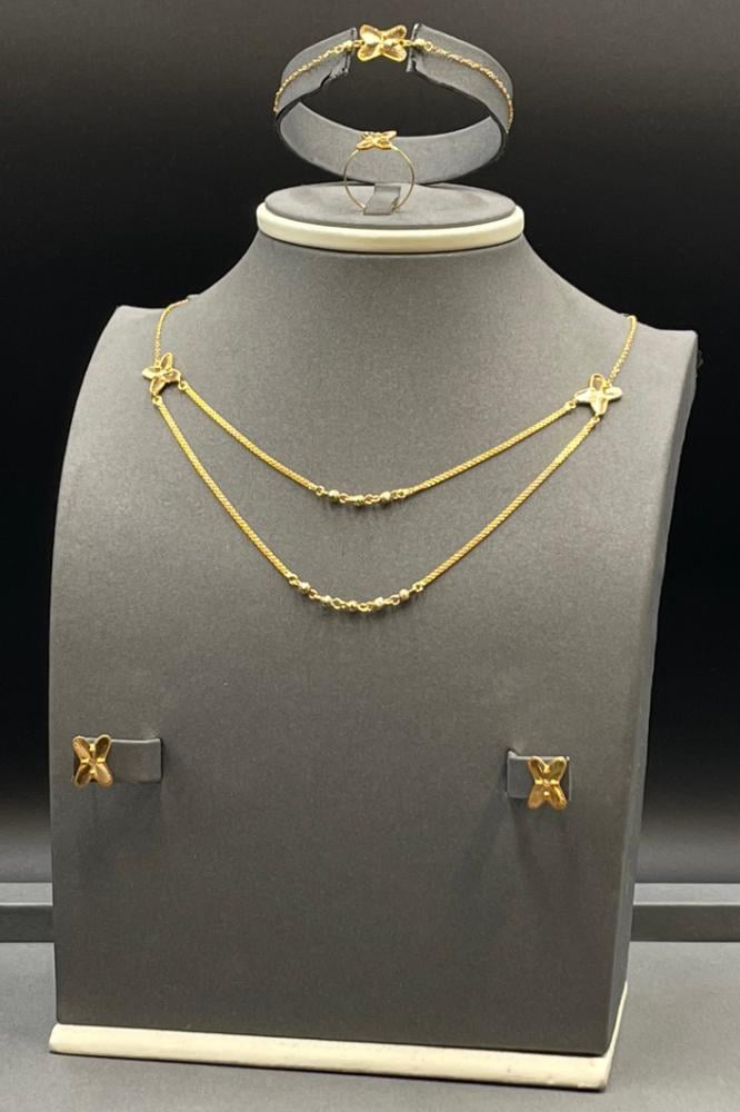 بوزن 10.9 جرام فقط، يتميز الطقم بتصميم مبتكر مستوحى من الأناقة العصرية والبساطة الراقية، مناسب للاستخدام اليومي وللمناسبات الصغيرة، ويمنحك إطلالة مميزة ملفتة للنظر.