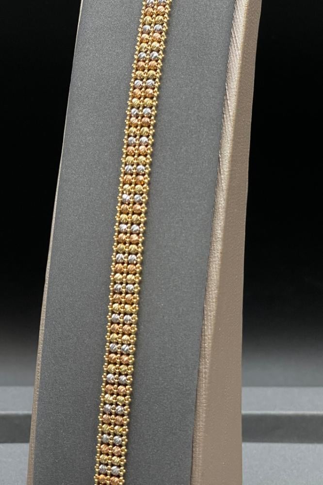 تألقي بأسلوب راقٍ وفاخر مع اسوارة ذهب عيار 18 بتصميم كور ذهبية صافية بوزن 12.9 جرام، وكوني دائمًا متألقة بأجمل الإطلالات. 🌹