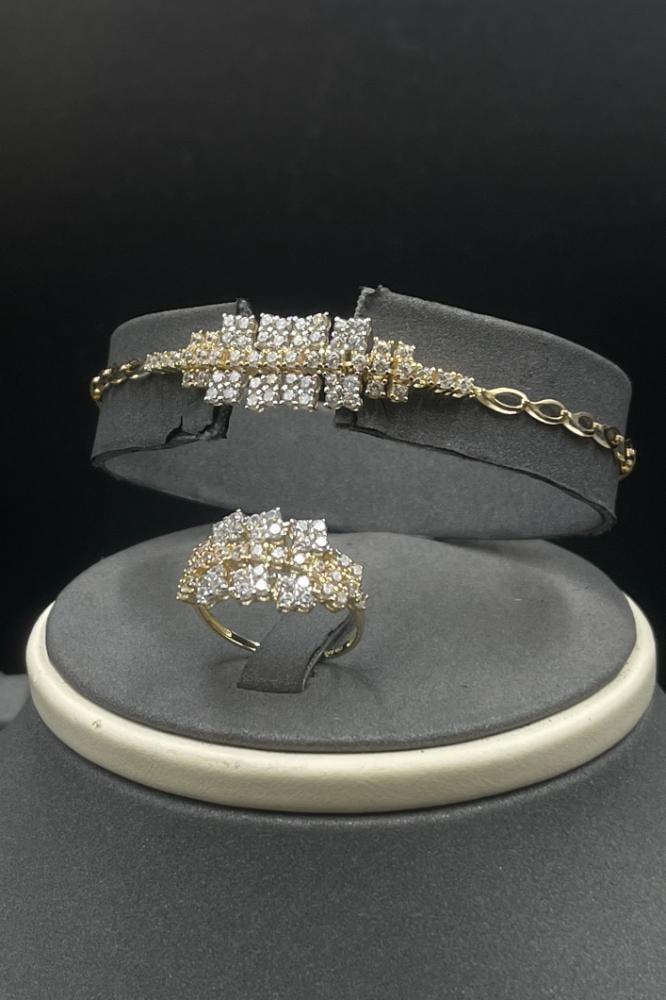 ارتقي بجمالك مع طقم وردة ذهب عيار 18 بتصميم الماس من متجر خالد حلبي.