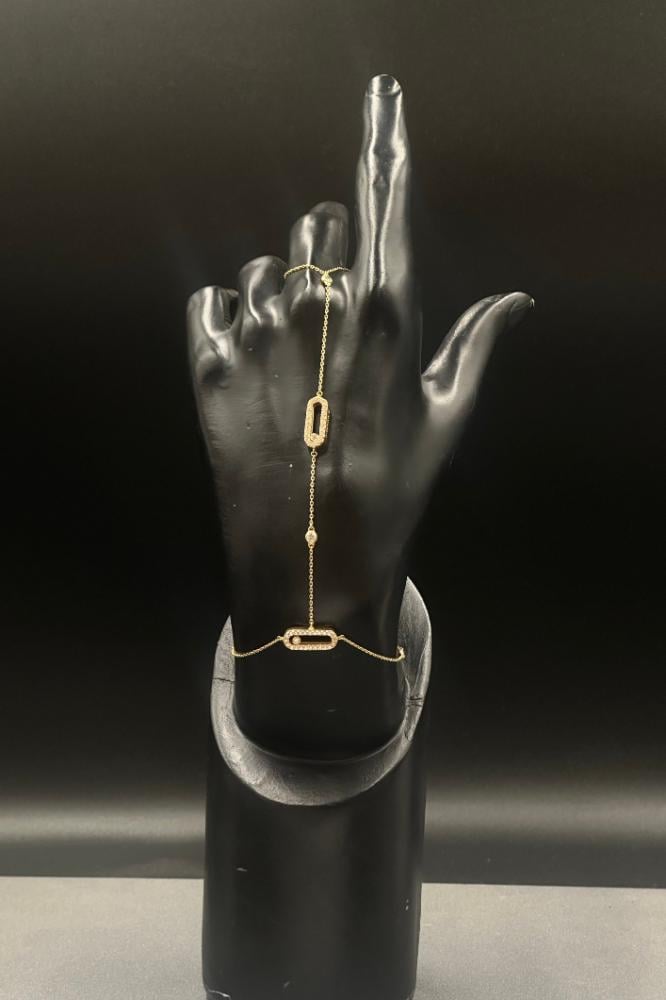 تألقي بأناقة وفخامة مع كف اليد الذهبي المصمم بشكل مستطيل الماس. بوزن 6.2 جرام، هذا التصميم المميز يضيف لمسة من البريق والفخامة على معصمك ويكمل إطلالتك بكل رقي.
