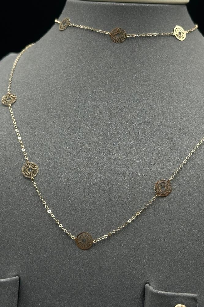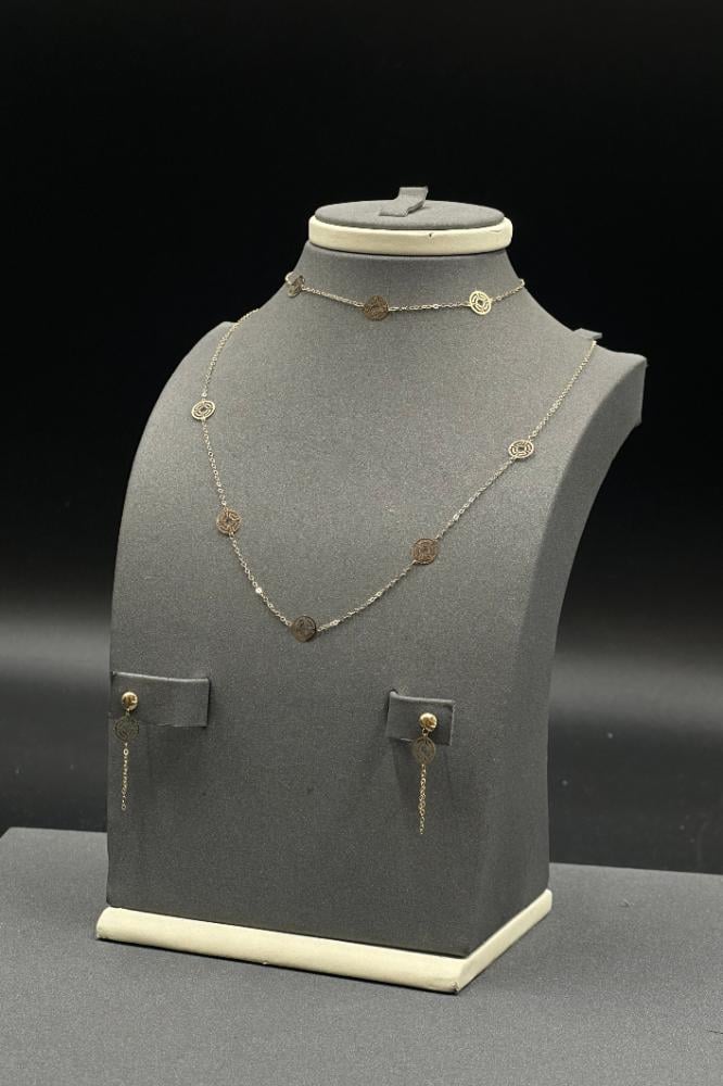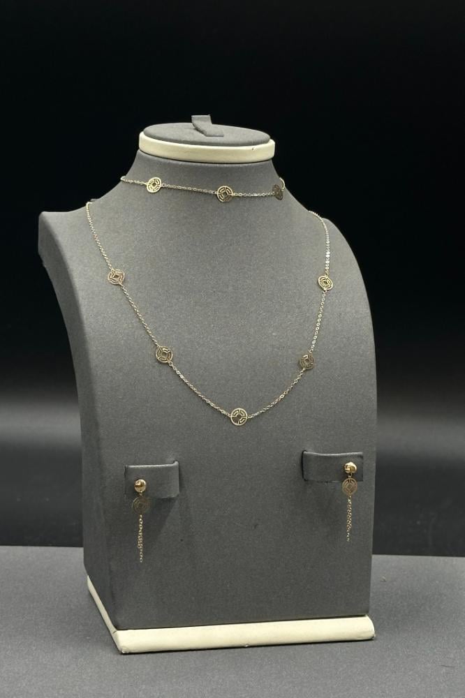 تميزي مع طقم الذهب الصافي عيار 18 بتصميمه الدائري الأنيق. بوزن 1.5 جرام، هذا الطقم يجمع بين البساطة والفخامة، مثالي لكل المناسبات ويضيف لمسة من الأناقة لكل إطلالة. صمم ليمنحك شعوراً بالتميز والروعة في كل مرة ترتدينه.