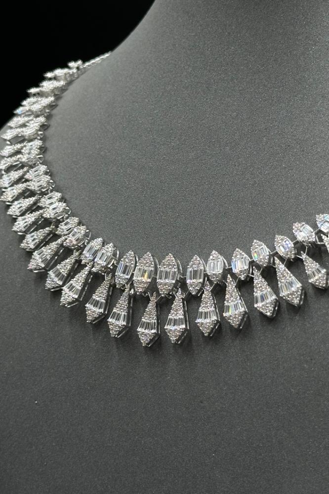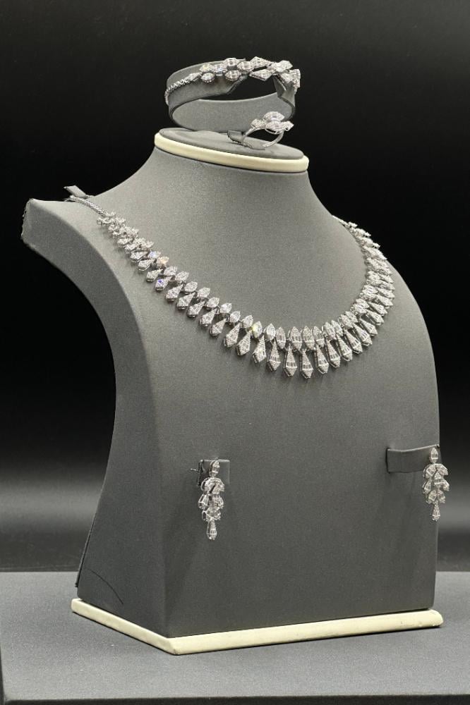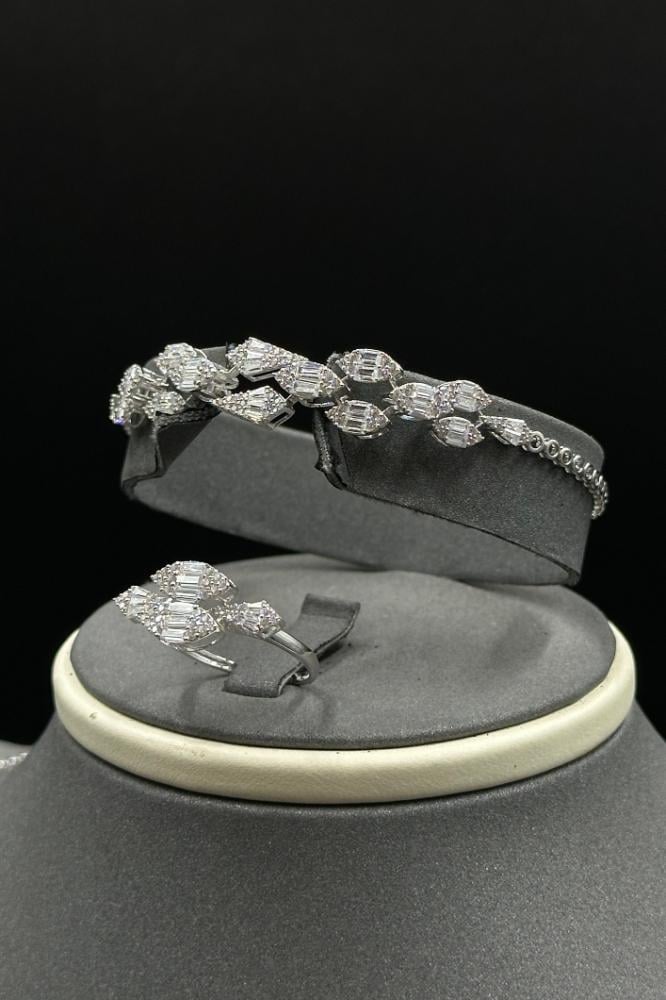 خلي طلتك تبهر الكل مع طقم الذهب الأبيض الجديد بتصميم الألماسي الفاخر. بوزن 39.1 جرام، هذا الطقم يجمع بين الفخامة والجمال ويضفي لمسة مميزة على كل مناسبة. تصميم الألماس الرائع يخليكِ تبرزين بأناقة ورقي.