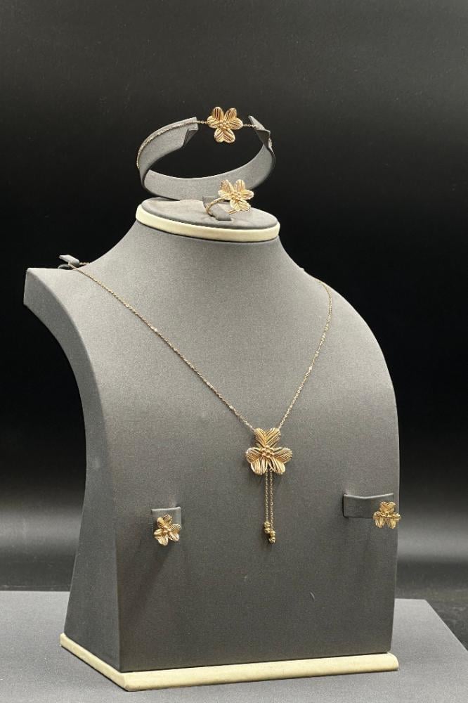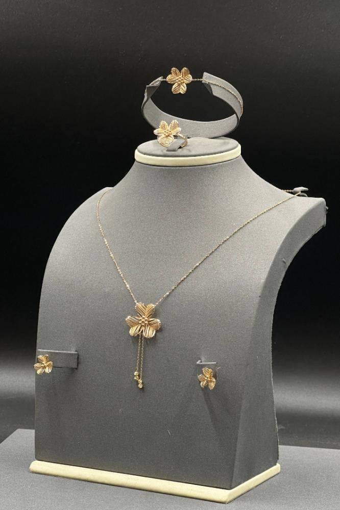 تألقي بطقم الذهب الملكي الفخم بتصميم وردة وكور ذهبية. مصنوع من ذهب عيار 21 وبوزن 9.8 جرام، هالطقم يضيف لمسة من الفخامة والجمال على كل إطلالة. تصميم الوردة مع الكور الذهبية يبرز جمالك ويضفي لمسة راقية ومميزة لكل مناسبة.
