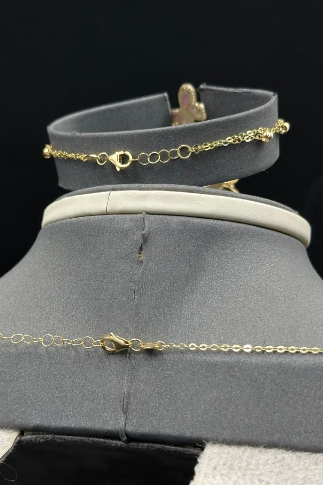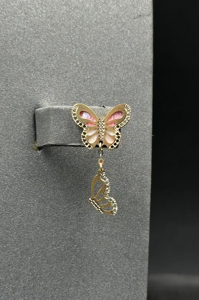 أبرزي أنوثتك الناعمة مع طقم الفراشة من الذهب عيار 18 المزيّن بصدف وردي وأبيض أنيق من متجر خالد حلبي.