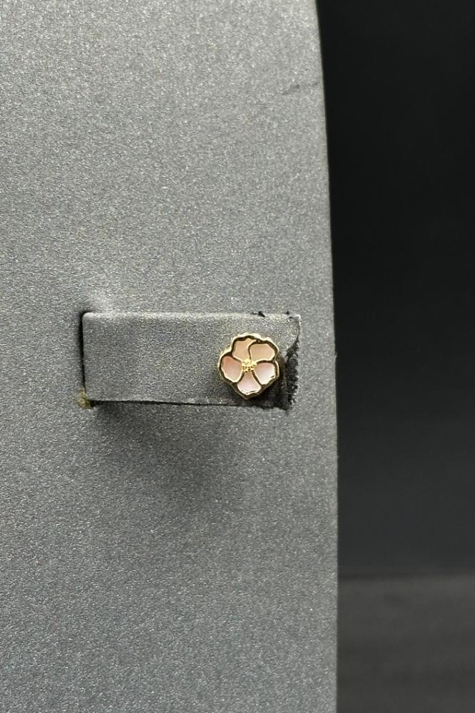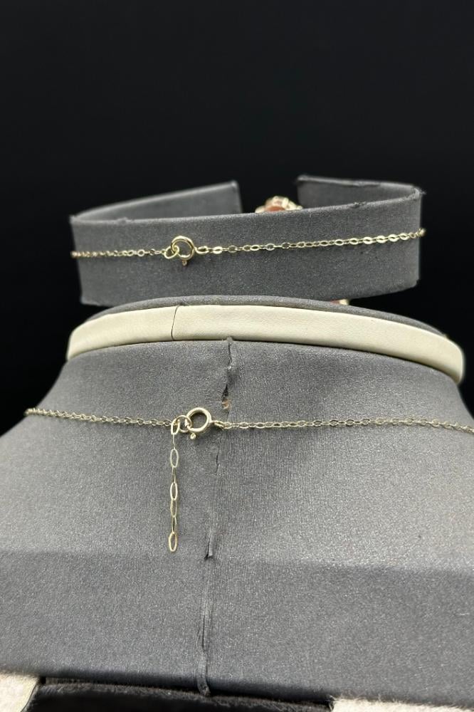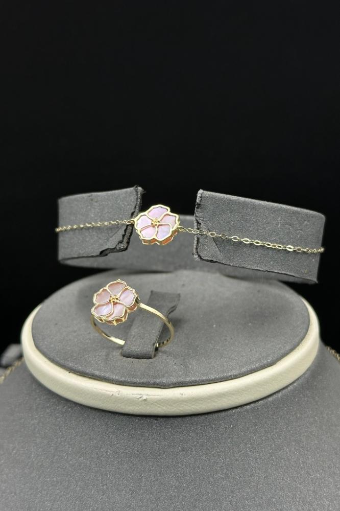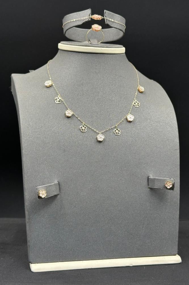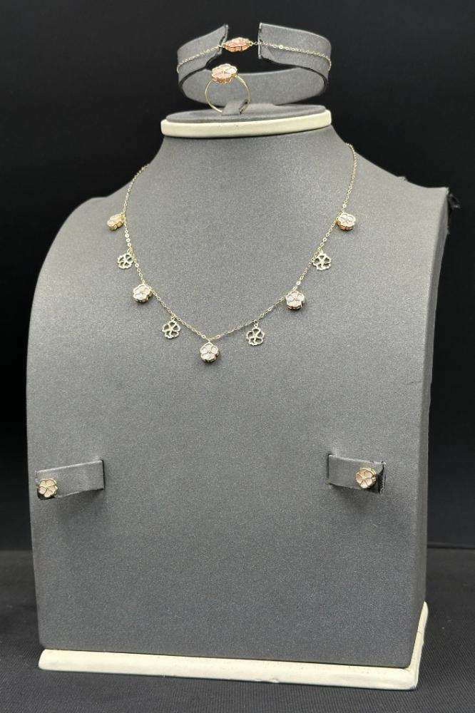 وزن من 5.8 الى 5.9 جرامعيار 18طول العقد 38 سم طول الاسوارة 19 سمطقم وردة مفرغ ذهب مع صدف وردي سعر المنتج مرتبط بسعر الذهب العالمي