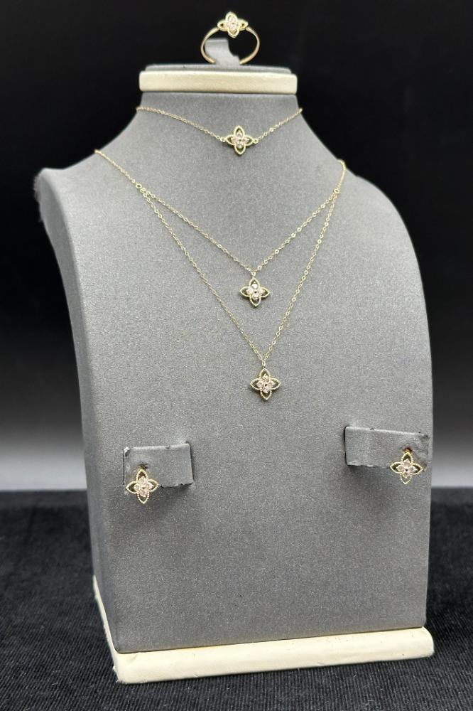 الطقم يتكوّن من عقد بطبقتين (دورين) وأقراط متناسقة مع خاتم ناعم يكمل جمال المجموعة. خيار مثالي للهدايا الراقية أو كإضافة أنيقة لمجوهراتك اليومية.