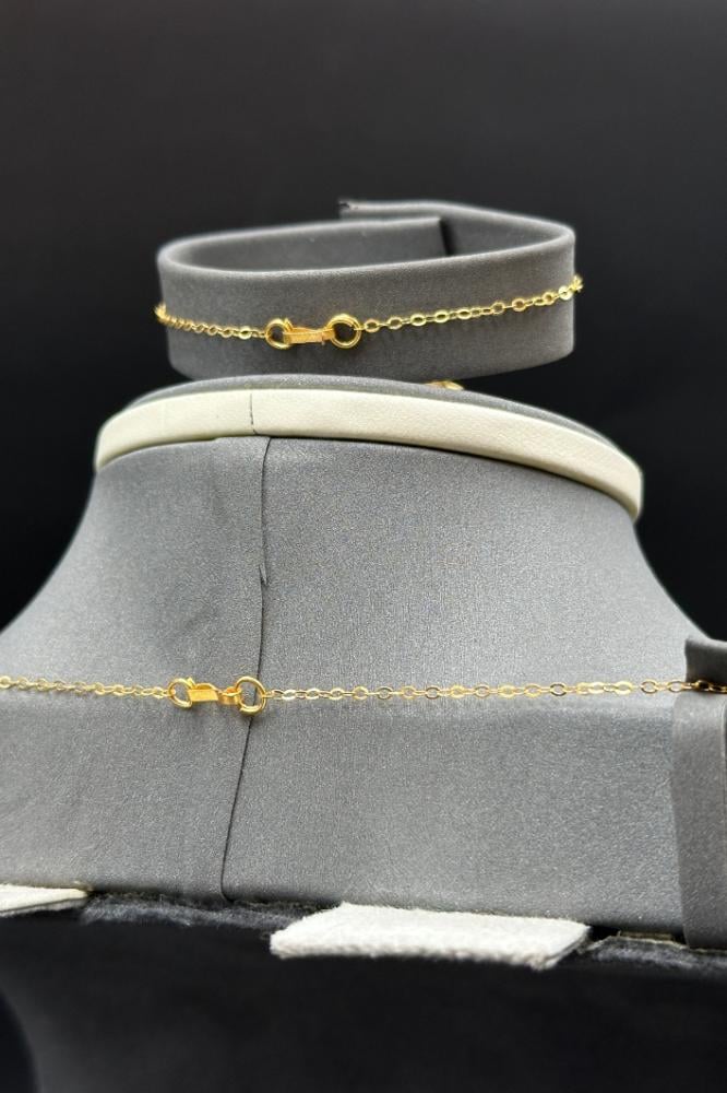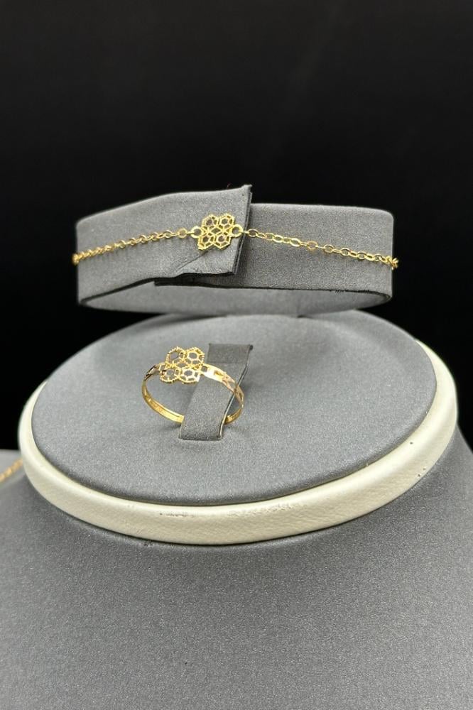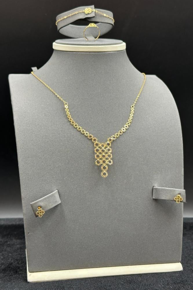 خلي أناقتك تنطق بالفخامة ✨ مع طقم ذهب صافي عيار 21 بوزن 4.6 جرام من متجر خالد حلبي. تصميم ناعم يضفي لمسة أنثوية جذابة، مناسب كهدية رقيقة أو كقطعة مميزة تضيفيها لإطلالتك اليومية.
