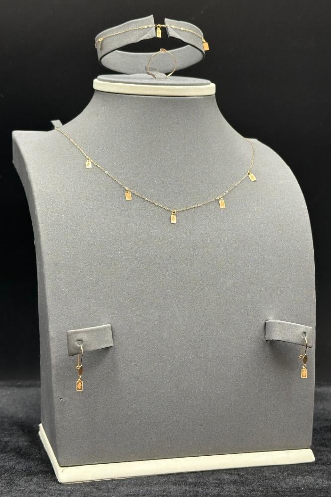 إذا كنتِ تبحثين عن قطعة ذهبية خفيفة وراقية ✨، فهذا الطقم المستطيل من الذهب الصافي عيار 21 بوزن يتراوح بين 1.4 إلى 1.5 جرام من متجر خالد حلبي هو خيارك المثالي. تصميمه البسيط والناعم يجعله مناسب للإطلالات اليومية أو كهدية أنيقة وخفيفة ترمز للذوق الراقي.