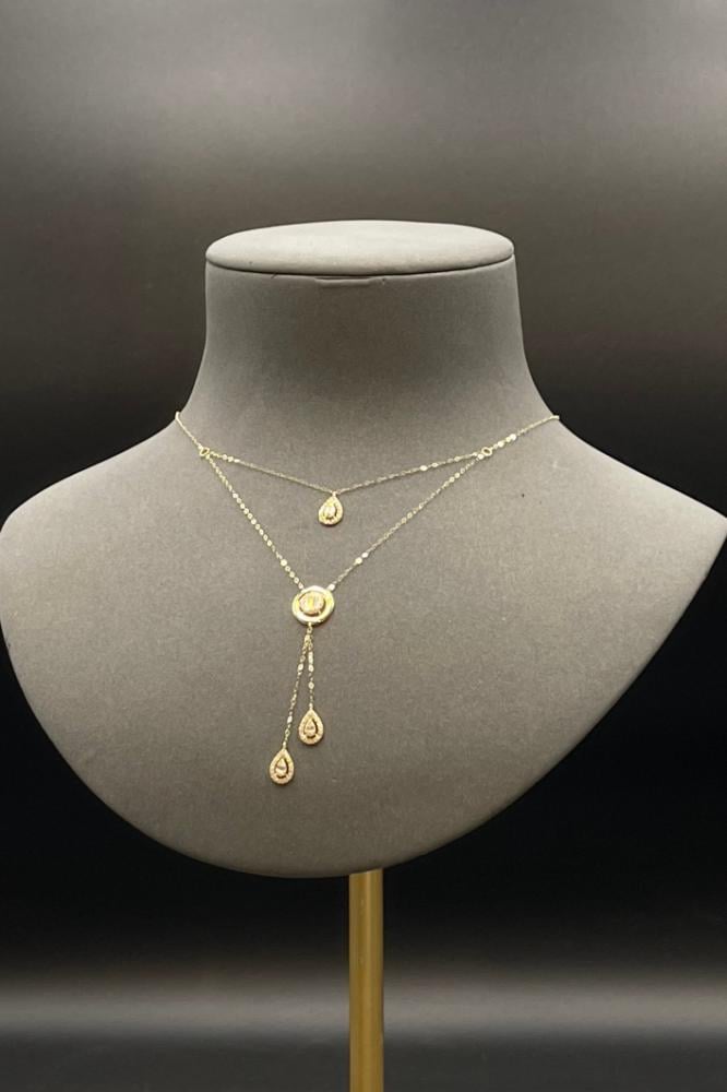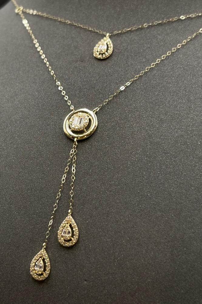 عقد ذهب دائرة مع دمعات نازله دورين ذهب تصميم الماس