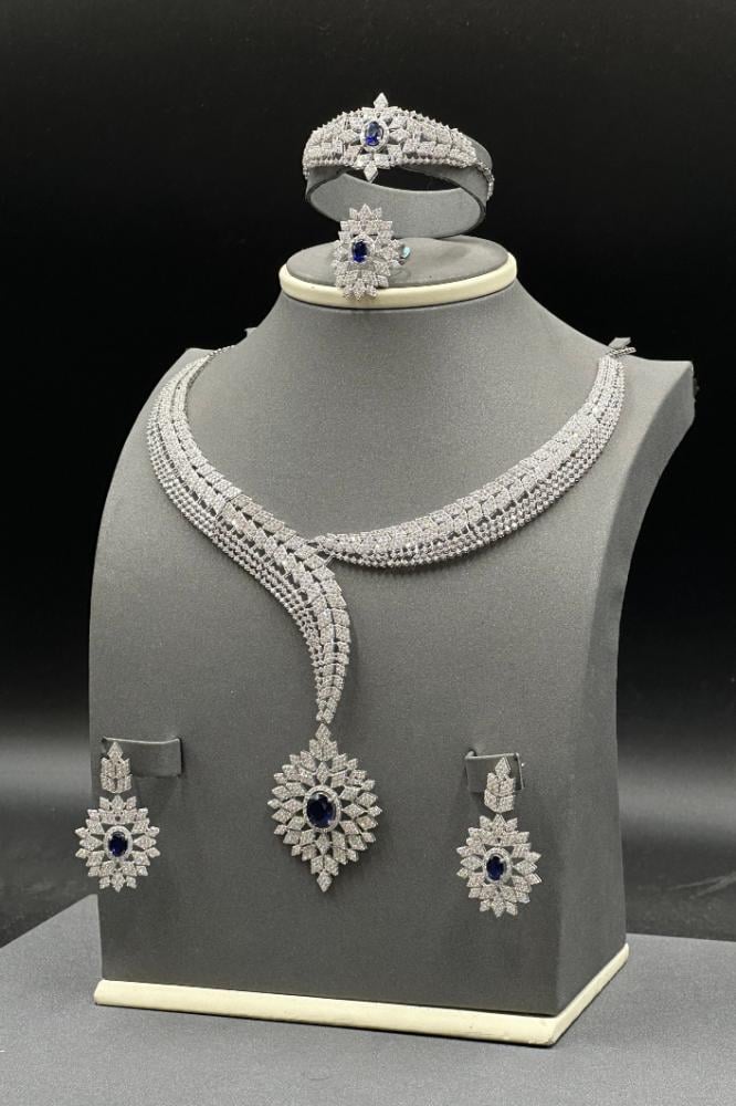 "الطقم هذا جداً أنيق وفخم، تصميم الألماس والفص الكحلي يخليه يلفت الأنظار." - ليلى ح. 🌟