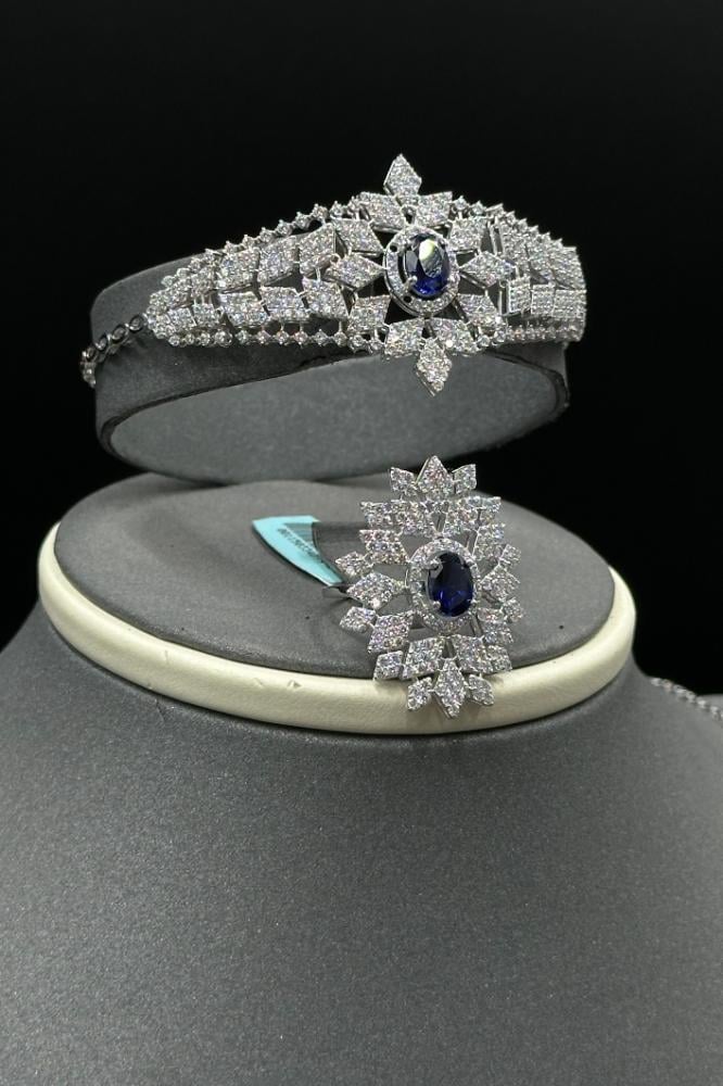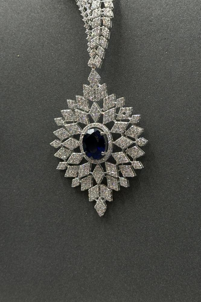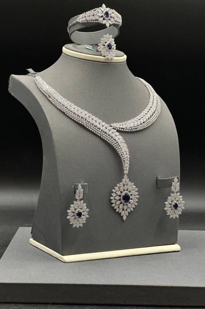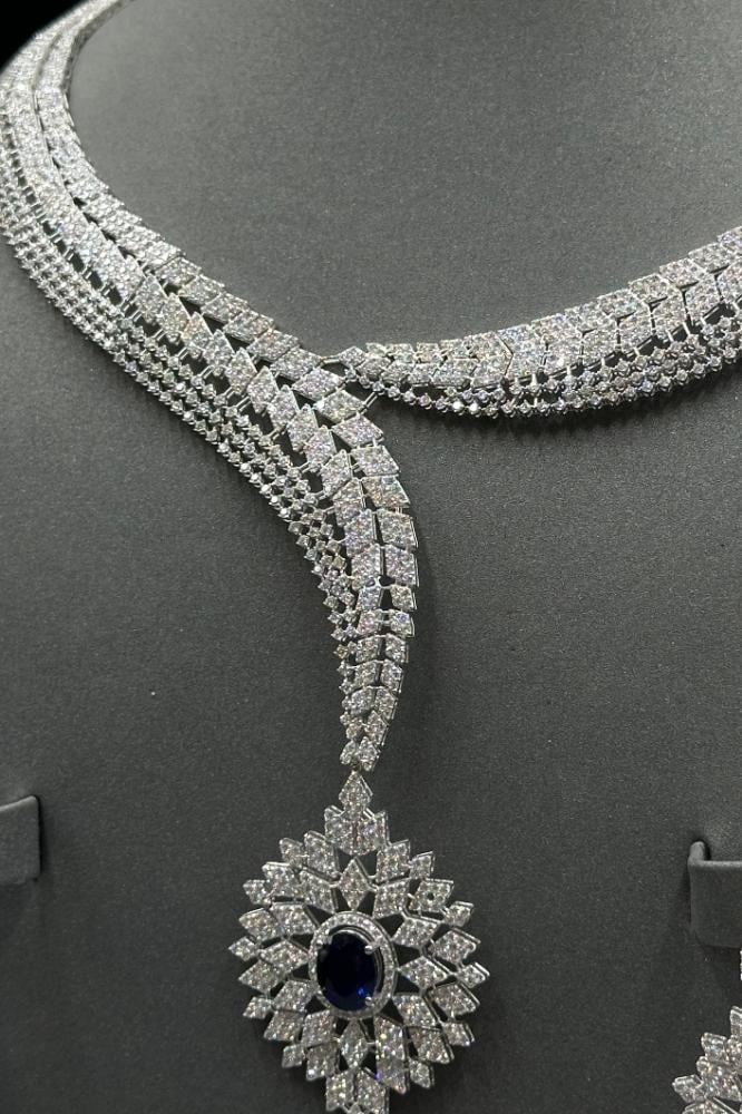 تألقي بطقم الذهب الأبيض الفخم بتصميم الألماسي الراقي وفص الكحلي المميز. بوزن 56.8 جرام، هذا الطقم يدمج بين الفخامة والجمال، ويضفي لمسة من البريق على كل مناسبة. تصميم الألماس مع الفص الكحلي يجعلكِ محط الأنظار في كل مكان.
