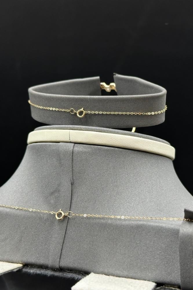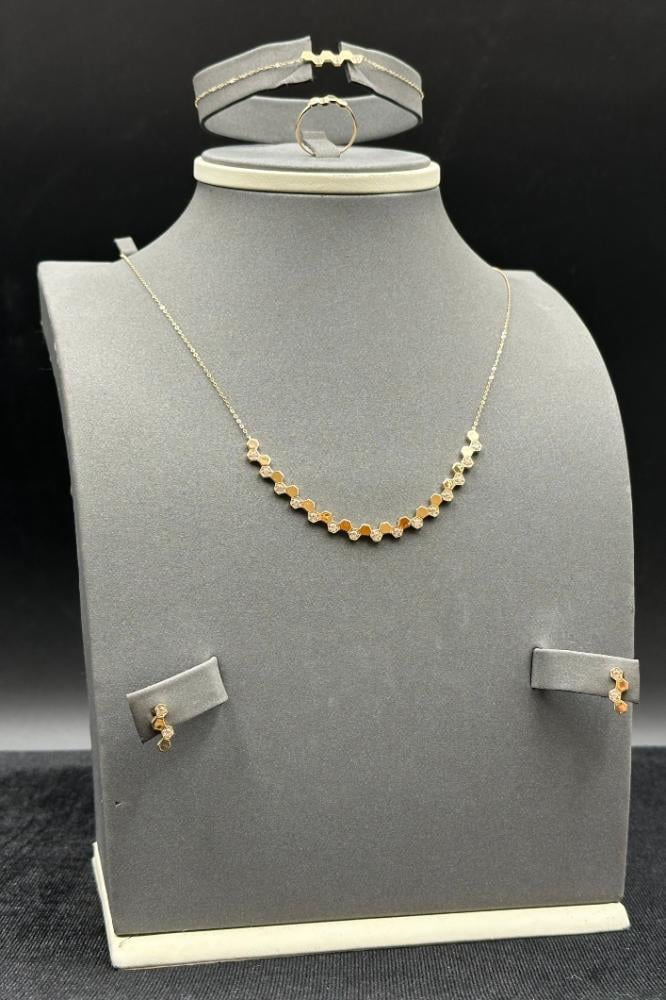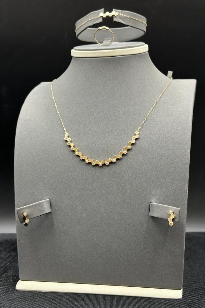 لا تفوتي فرصة التألق بهذا الطقم الفخم، اكتشفي تشكيلتنا الحصرية من أطقم الذهب 18 عيار مع تصميم ألماس مناسبة للشبكة.