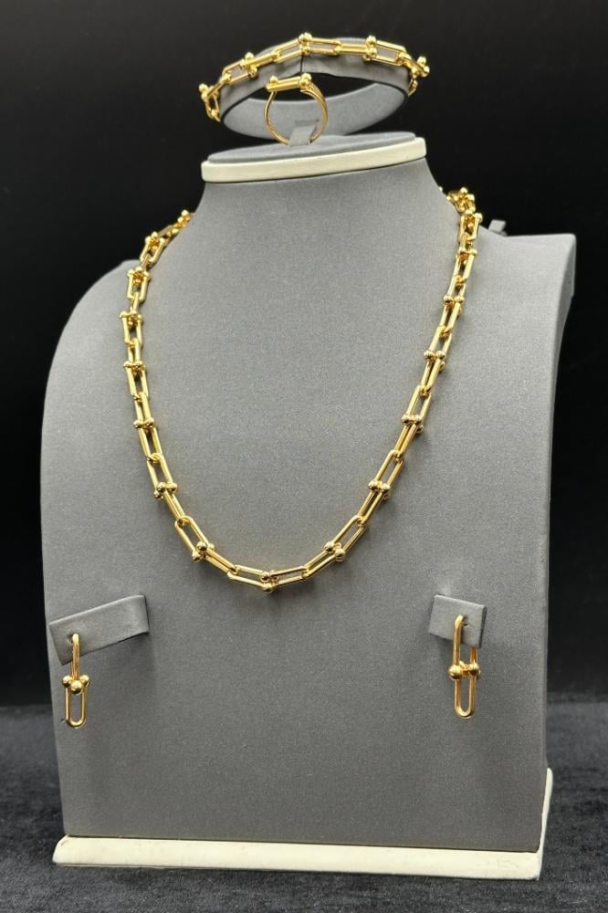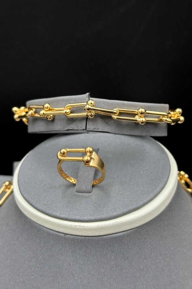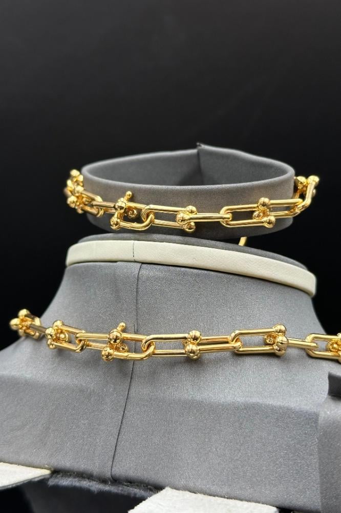 Specifications:Weight: 34.7 grams21 karatNecklace length: 46 cmBracelet length: 19 cmPure gold chain setPrice is linked to the global gold price.