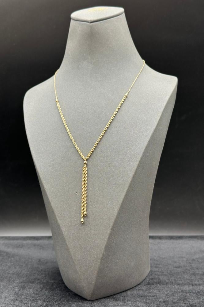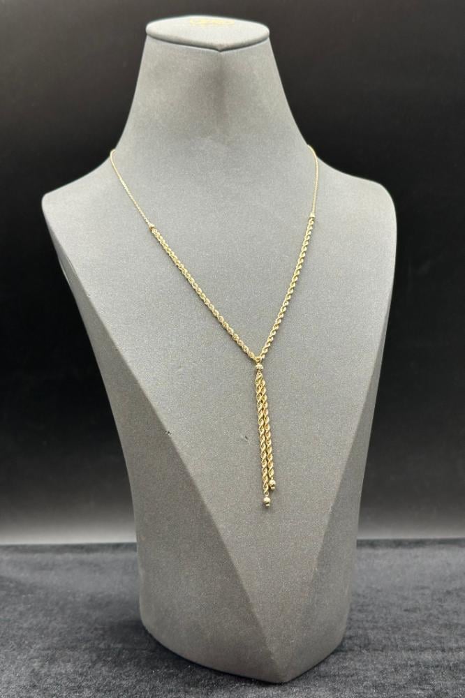 Specifications:Weight: 2.3 gramsPurity: 18KNecklace Length: 56 cmDesign: Solid Gold Hanging Braided NecklacePrice: Linked to the global gold price.