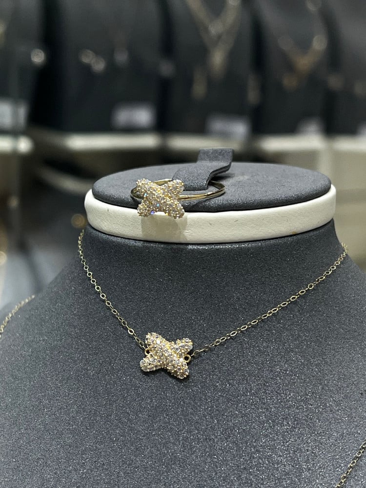 تميزي بطقم الذهب بتصميم X الألماسي عيار 18 بوزن 2.7 جرام، وخلّي إطلالتك دايمًا أنيقة وجذابة ومليئة بالفخامة. 🌹